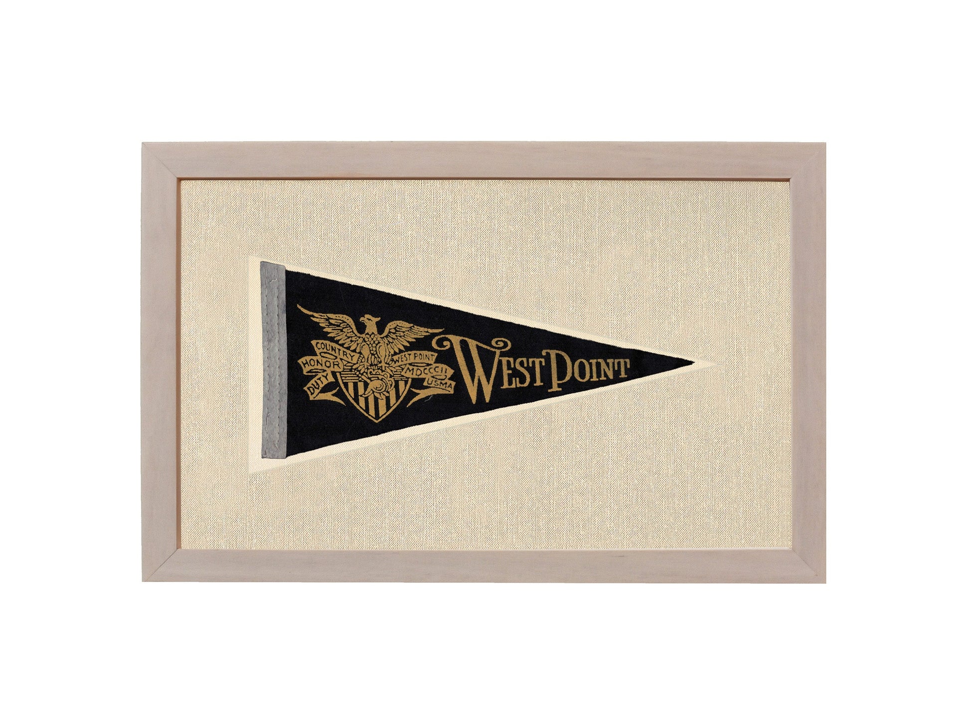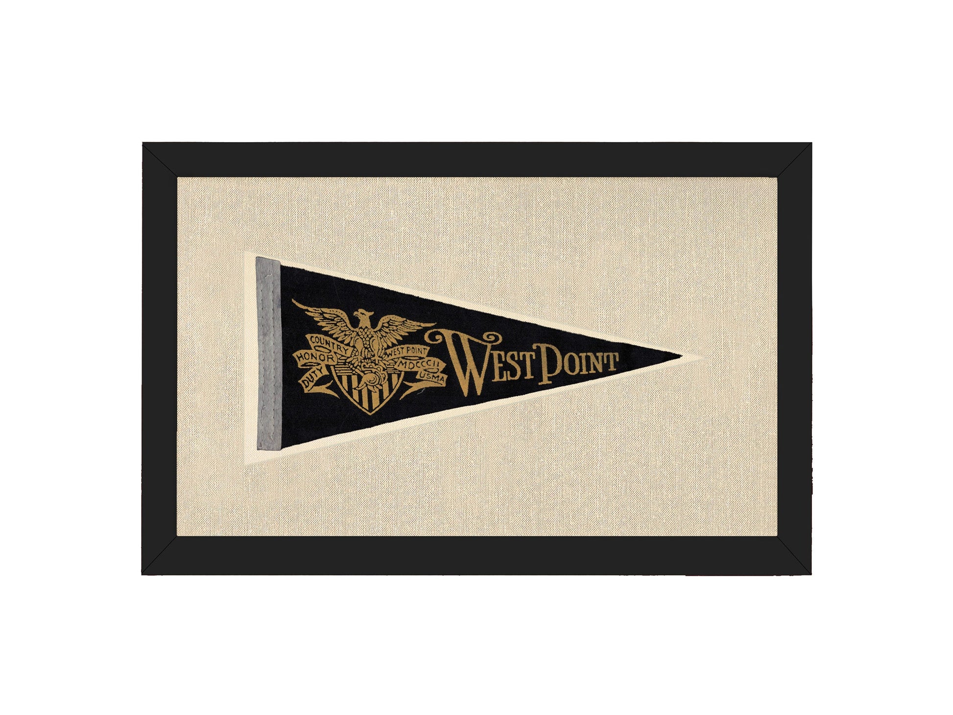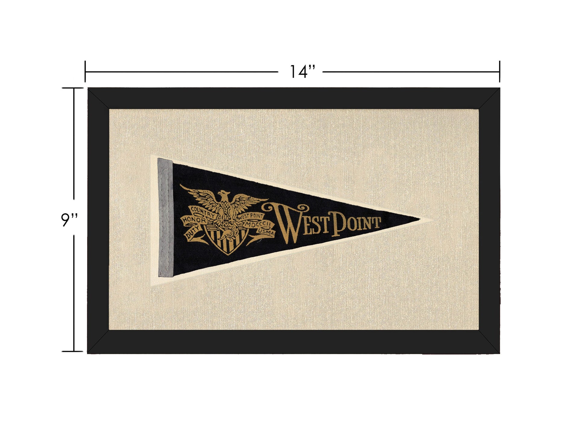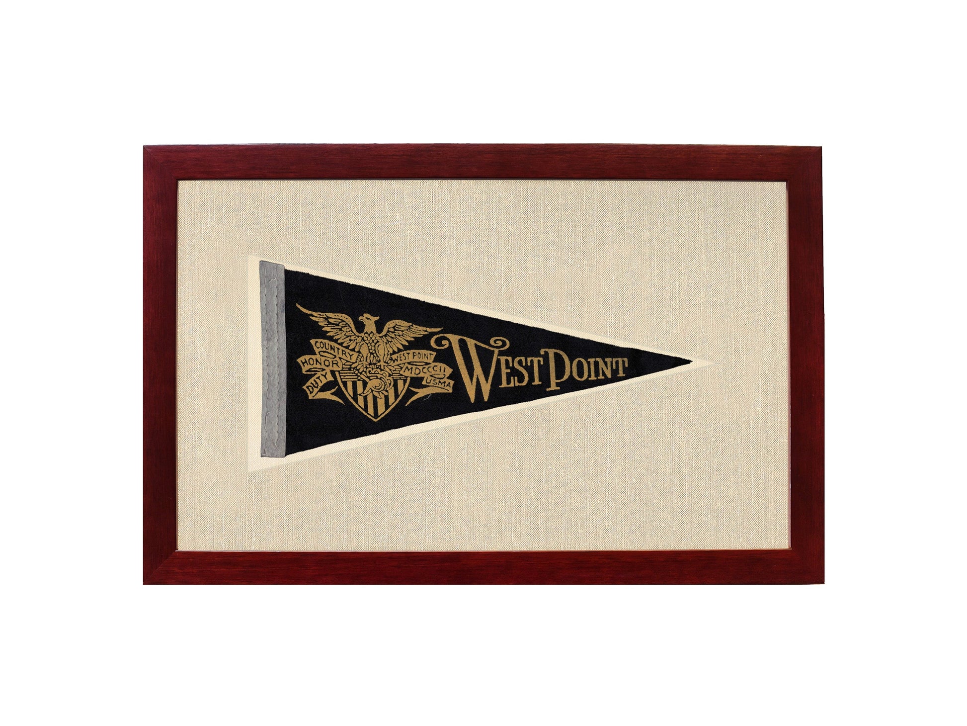 A rare piece of vintage history from the United States Military Academy at West Point, this pennant from the 1950s is available in your choice of Black, Mahogany, or Light Wood frame. Framed in U/V glass and cut mat.